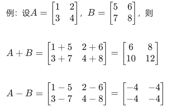 矩阵加减法的规则非常直观:两个同型矩阵相加减,结果为对应位置的元素分别相加减。