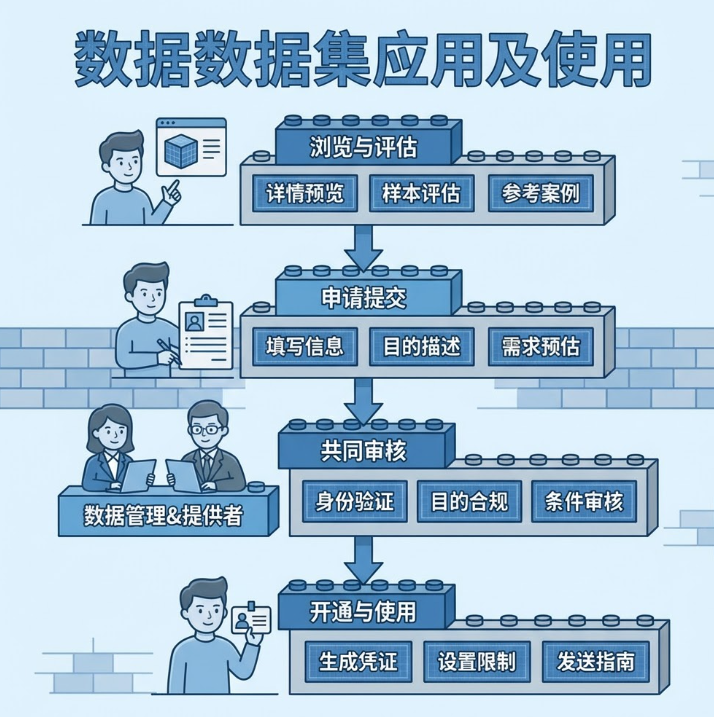 当业务部门或用户在数据超市中发现需要使用的数据集时,首先会进行数据集浏览与评估,通过查看数据集详情了解数据内容、结构和使用条件,预览数据样本评估数据质量和适用性,并参考其他用户的评价和使用案例;随后进入申请提交环节,填写包含申请人信息和所属部门、申请使用的数据集ID和版本、使用目的和场景描述、预计使用期限以及数据量需求在内的数据使用申请表;提交后,数据管理部门和数据提供方会共同对申请进行审核,重点审核申请人的身份和权限验证、使用目的的合法性和合理性、申请数据量的适当性以及是否符合数据使用的约束条件;审核通过后,系统将自动为申请人开通数据访问权限,包括生成临时访问凭证、设置访问有效期和数据量限制,并发送访问链接和使用指南。