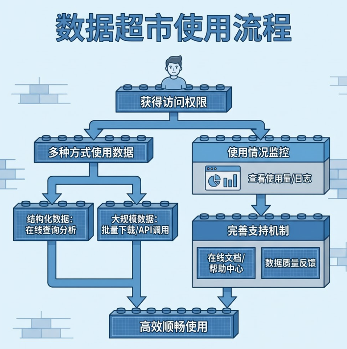 获得访问权限后,用户可以通过数据超市提供的多种方式使用数据,包括在线查询分析、批量下载和API调用等。对于结构化数据,用户可以直接在数据超市平台上进行查询、筛选和可视化分析;对于大规模数据集,支持批量下载到本地或通过API集成到业务系统中使用。在使用过程中,用户可以随时查看自己的使用情况,包括已使用的数据量、剩余配额和访问日志等。同时,数据超市还提供了完善的使用支持机制,用户可以通过在线文档、帮助中心或联系客服获取技术支持,遇到数据质量问题时可以直接向数据提供方反馈,确保数据使用过程顺畅高效。