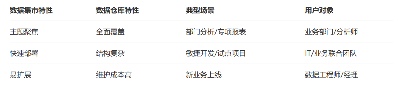 那为什么数据集市这么重要?之前我们构造的数据仓库或者说高质量数据集文件不可以直接拿来用吗?可以是可以,但是不够便捷,不够规范! 企业级数据仓库往往过于庞大,建设周期长,维护成本高,业务变化难以快速响应。而数据集市以“敏捷、灵活、聚焦”为特性,能够在业务部门与数据技术之间架起桥梁,实现数据“最后一公里”落地。