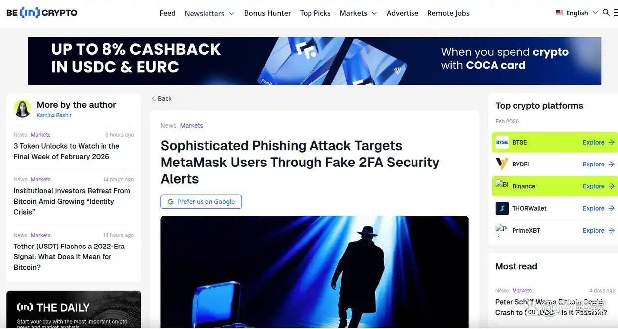 近年来,针对加密货币领域的网络攻击已从早期的智能合约漏洞利用、交易所黑客入侵,逐渐演变为针对终端用户的社会工程学攻击。特别是2023年至2024年间,钓鱼攻击的手段发生了显著质变。攻击者不再仅仅满足于制作粗糙的仿冒登录页,而是开始利用宏观监管环境收紧、知名交易所暴雷等社会热点,制造恐慌情绪,进而实施精准诈骗。乌克兰媒体UA.News与加密媒体BeInCrypto近期披露的一系列针对MetaMask用户的攻击案例,标志着此类威胁进入了新阶段。攻击者通过邮件、社交媒体及恶意广告弹窗,散布“账户锁定风险”或“强制安全更新”的虚假信息,诱导用户访问精心伪造的安全验证页面。在这些页面中,攻击者模拟了中心化服务常见的双因素认证(2FA)流程,甚至伪造验证码输入环节,以此降低用户的防备心理,最终诱骗用户输入助记词。