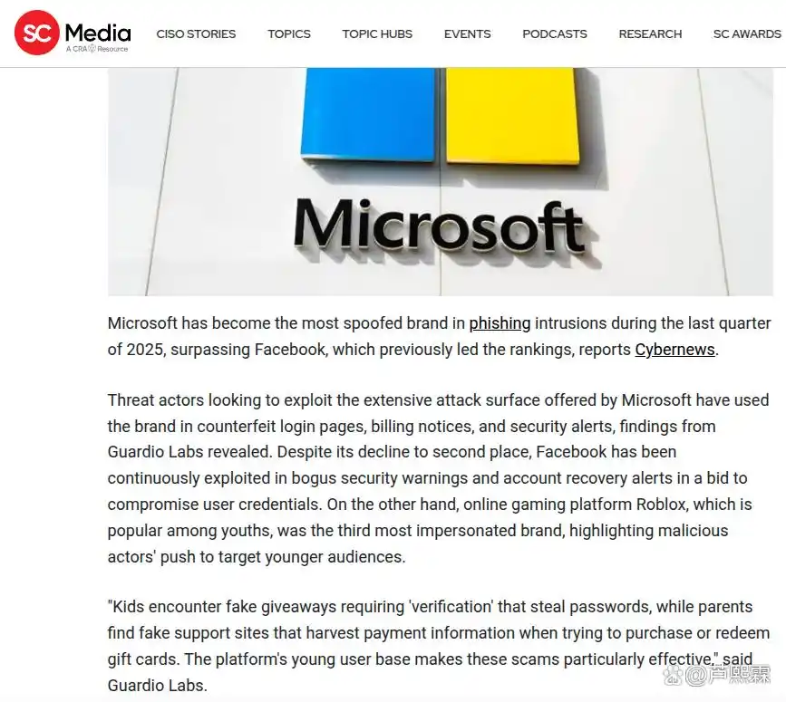 2025 年第四季度品牌冒充排名的变化,标志着钓鱼攻击已进入精准化、专业化、产业化的新阶段。Microsoft 登顶被冒充榜首,反映了企业数字化转型背景下云端生产力工具成为攻击新焦点;Facebook 维持高位,说明社交账号的情感价值与数据价值仍是攻击者的核心目标;Roblox 跻身前三,则揭示了青少年群体作为新兴攻击目标的巨大风险。