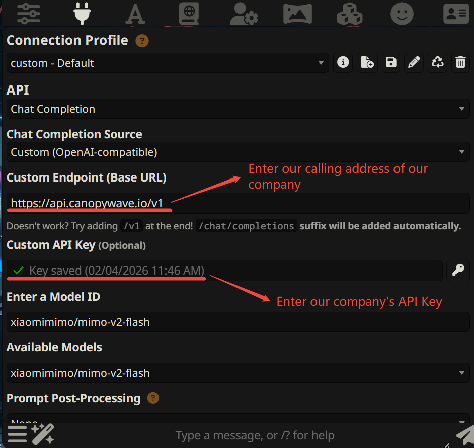 在“API 连接”部分,应将“API”选项设置为“聊天完成”。
