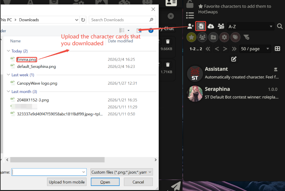 目前,网上仍有众多此类网站。您可以进行搜索。如果某些网站没有您所需的内容,那就切换到另一个网站。如果这样也无济于事,我可以帮您使用人工智能创建一个角色卡。现在,我来给您展示一个。 首先,下载角色卡,然后将其上传至“Silly Tavern”。