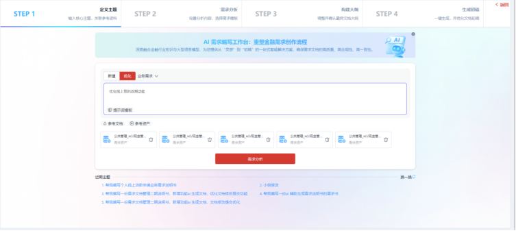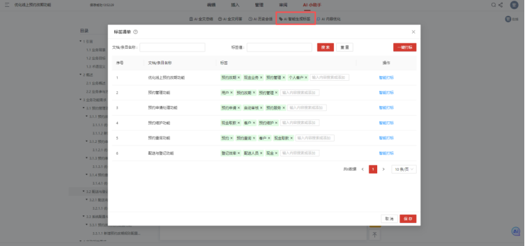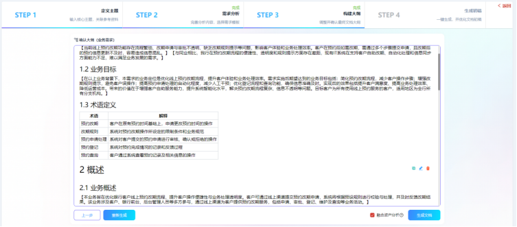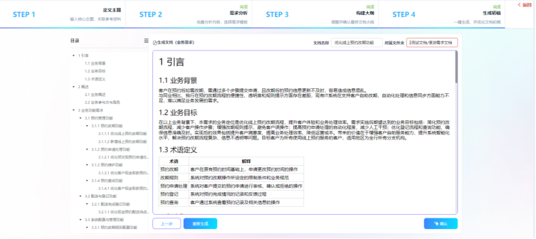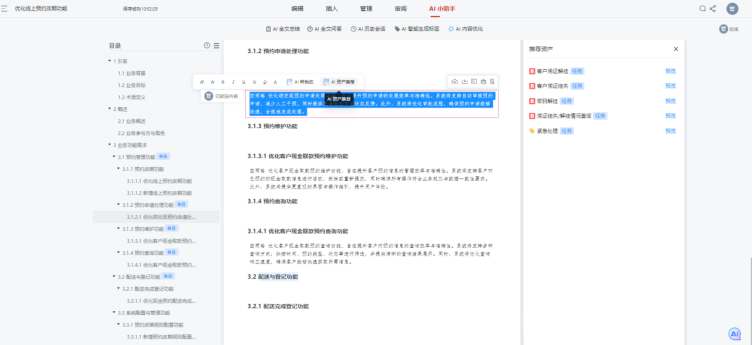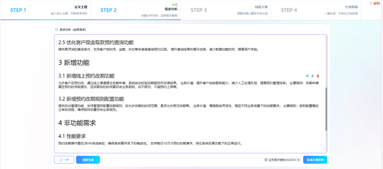 Visual RM的AI智能编制功能彻底解决这一痛点,通过“定义主题→需求分析→构建大纲→生成初稿”四步标准化流程引导编写。产品经理仅需输入核心需求主题,AI便能依托NLP、大模型和知识图谱技术,补全功能核心规则、触发条件、输出结果等关键内容。例如输入“优化线上预约改期功能”,AI会自动补充改期时间范围(预约前24小时内可改)、次数限制(单订单最多改2次)、通知机制(短信+APP推送)等细节。同时,AI支持碎片化文档合并,能将散落在不同文档中的同类需求一键整合,智能去重并补全逻辑漏洞,原本2人花1天才能完成的工作,半小时即可落地。更能实现跨类型需求精准转化,将“客户希望转账后立即收短信通知”等口语化业务需求,转化为“功能点+触发条件+输出结果”的标准化软件需求,甚至生成接口定义、数据流转等技术细节,打破业技壁垒,实现需求传递零偏差。