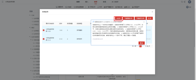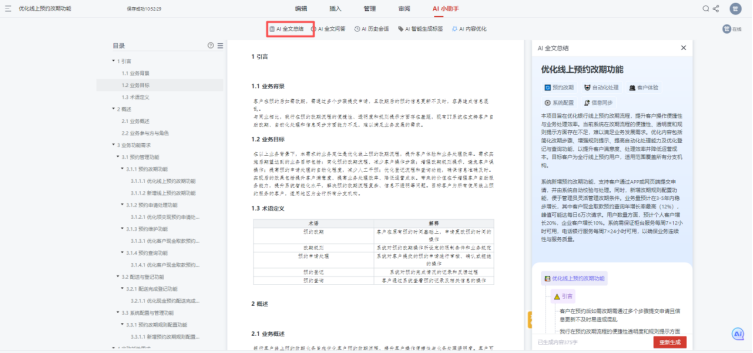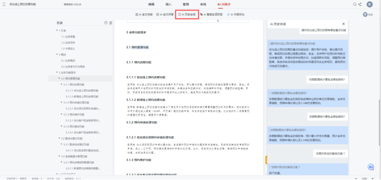 Visual RM的AI智能协作功能搭建起跨部门沟通的智能桥梁。其一,AI可对冗长需求文档生成“精华总结”,提炼核心目标、关键功能、依赖模块等信息,开发、测试无需逐页阅读,5分钟就能抓住需求重点,大幅降低信息获取成本。其二,支持全文问答功能,相关人员有疑问时可直接与AI对话,例如询问“改期数据统计要包含哪些指标”,AI会从文档中精准提取改期成功率、时段分布、改期后取消率等答案,省去产品经理反复解答同类问题的麻烦。其三,AI会记录需求沟通的历史会话,方便各部门随时回溯,避免因记忆偏差导致的理解分歧。此外,在需求版本迭代时,AI能自动生成版本概述,清晰标注新增、修改、删除内容,还可自动为文档打标签,便于后续快速检索,让跨部门版本管理更高效,协作效率直接翻倍。