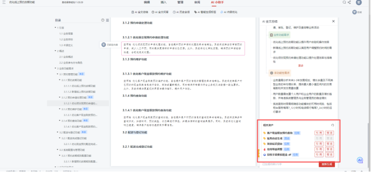 Visual RM的AI智能资产管理功能通过三重推荐机制,精准匹配可复用资产。在全文维度,上传新的“体检预约改期”需求后,AI会推荐相似度85%的2022年“门诊预约改期”资产,提示可复用改期规则、通知逻辑;在划词维度,选中“改期通知”,AI会调出旧需求里的通知模板,一键引用即可使用;在关联维度,推荐与当前需求相关的测试用例、接口文档、系统对接方案等,让产品经理无需四处搜集资料。同时,AI能整合多版本同类需求,生成通用需求模块,甚至基于现有资产衍生新规则——比如从“预约改期”资产中,衍生出“预约取消后资源释放规则”,让需求资产复用率大幅提升,避免产品经理与研发团队的重复劳动。