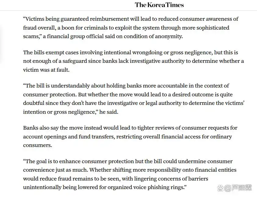 然而,这一政策提议在韩国金融界引发了强烈反弹。主要商业银行及金融协会代表指出,当前的诈骗手段已高度进化,攻击者利用深度伪造(Deepfake)语音、改号软件及复杂的心理剧本,使得即便拥有最先进AI监测系统的银行也难以做到100%拦截。若实施无差别的强制性全额赔偿,极可能引发严重的道德风险:用户在知晓资金损失将由银行兜底后,可能会放松对个人信息的保护警惕,甚至在极端情况下滋生与诈骗团伙合谋的“骗保”行为。此外,巨额的赔偿负担可能导致银行被迫提高服务费率、缩减数字化创新预算,或通过更严苛的风控措施误伤正常交易,最终损害整体金融生态的效率与公平。