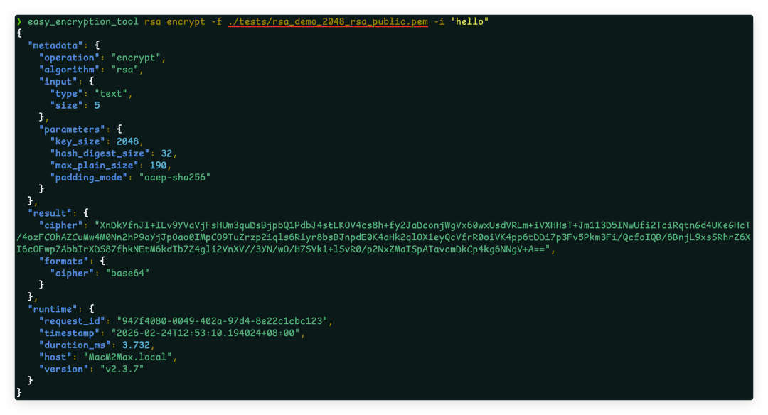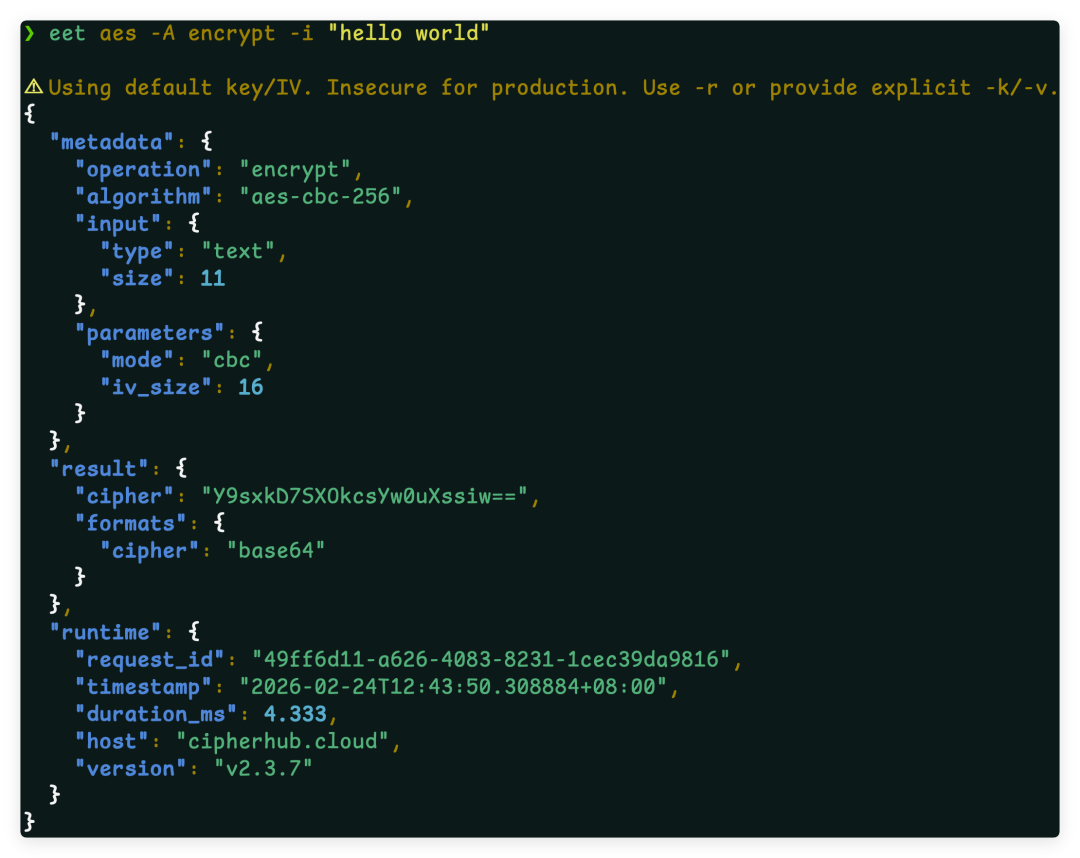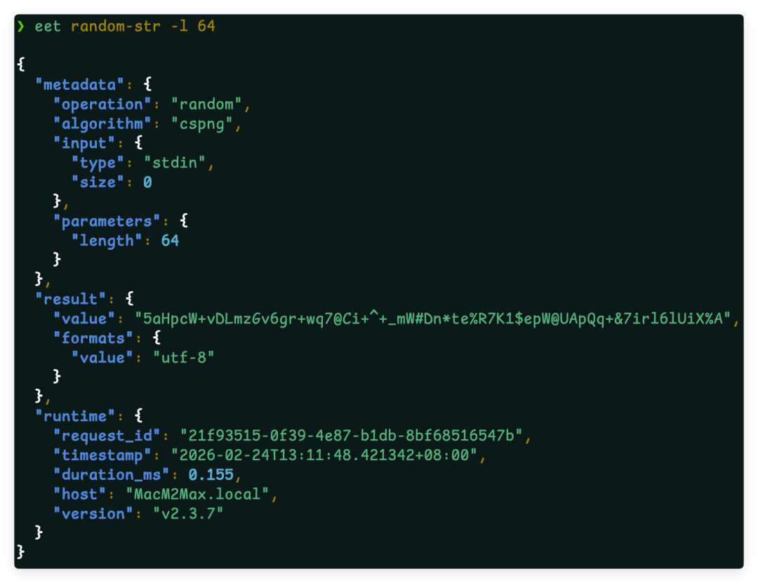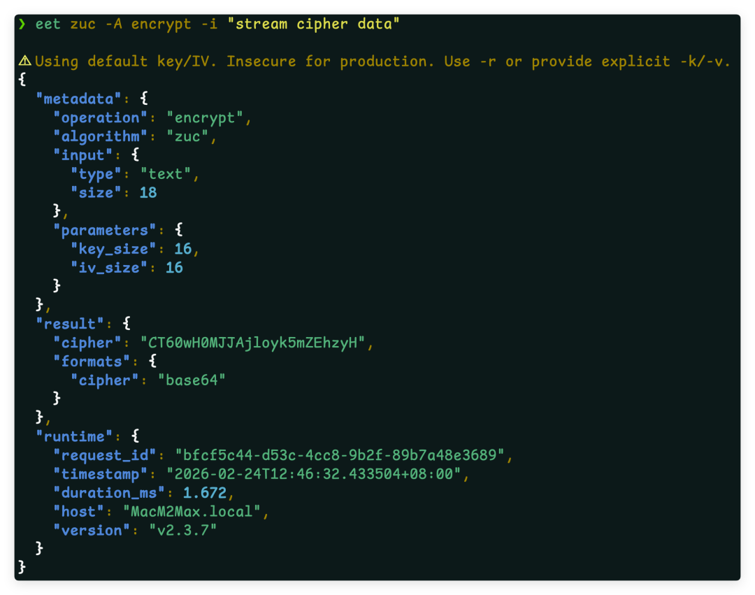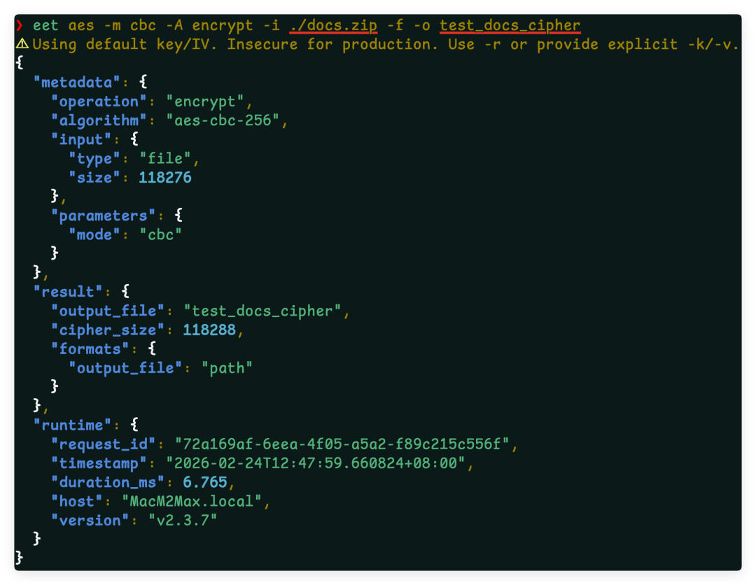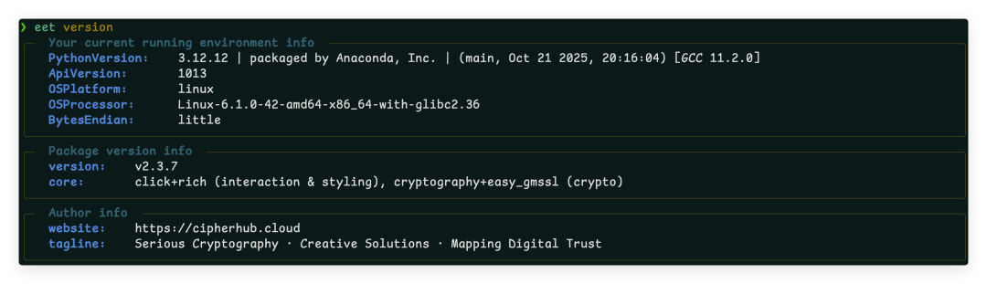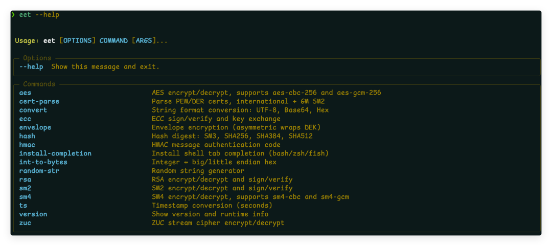 EET(Easy Encryption Tool)是一款功能丰富的命令行加密工具,支持主流国际算法与国密算法,适用于开发、测试、运维等场景的加解密、签名验签、哈希计算等操作。本文基于 EET v2.3.7 介绍其核心特性与典型用法。