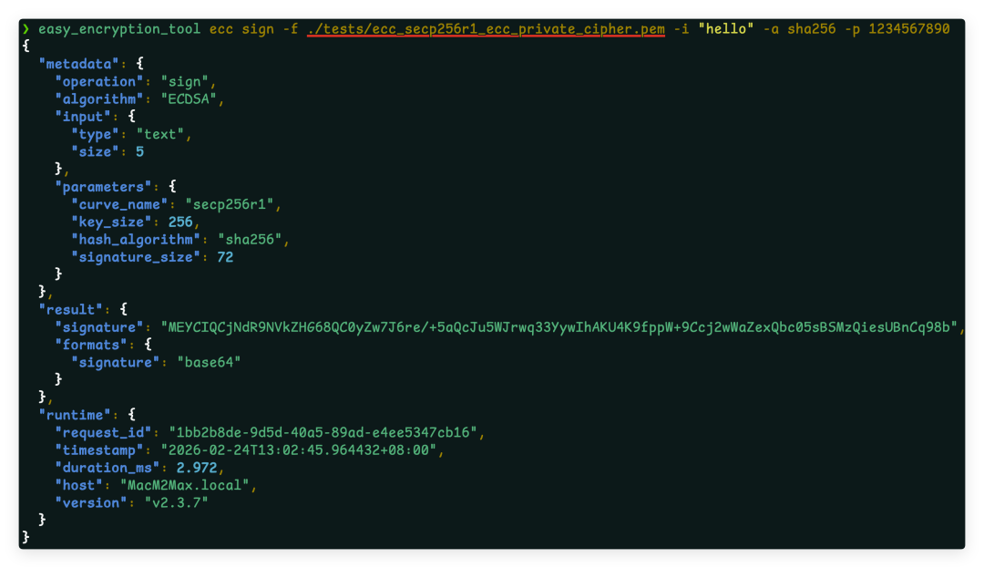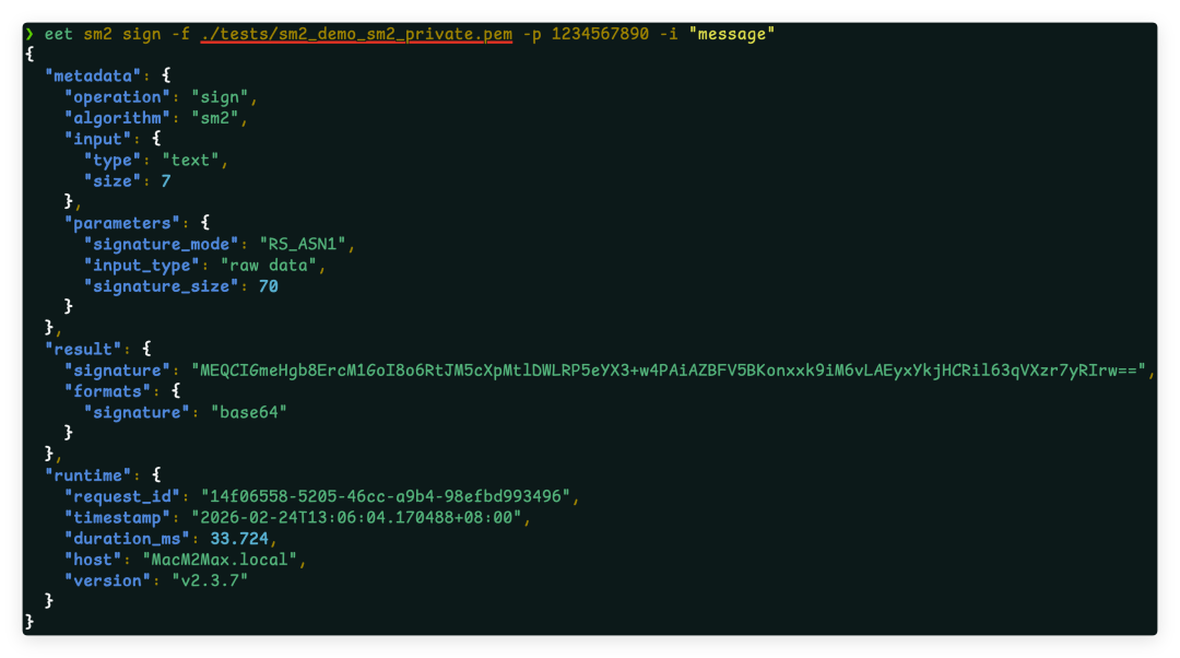 eet sm2 sign -f my_sm2_private.pem -i "message" -p "password"