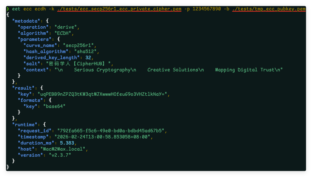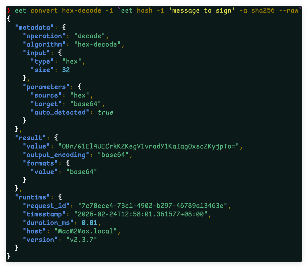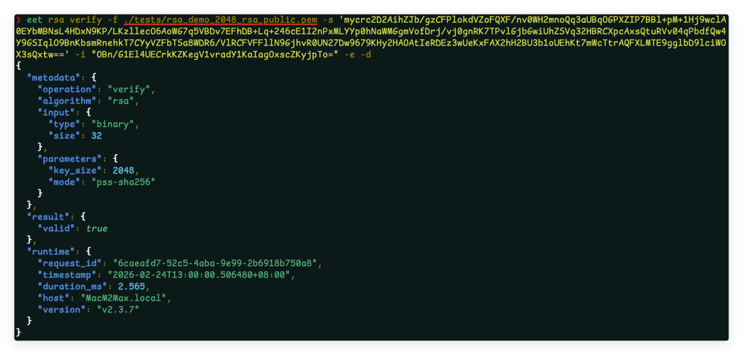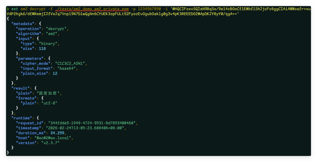 eet envelope decrypt -f priv.pem -i "$ENV" --aad "my-context-001" --raw支持 SHA256、SHA384、SHA512、SM3(国密)。