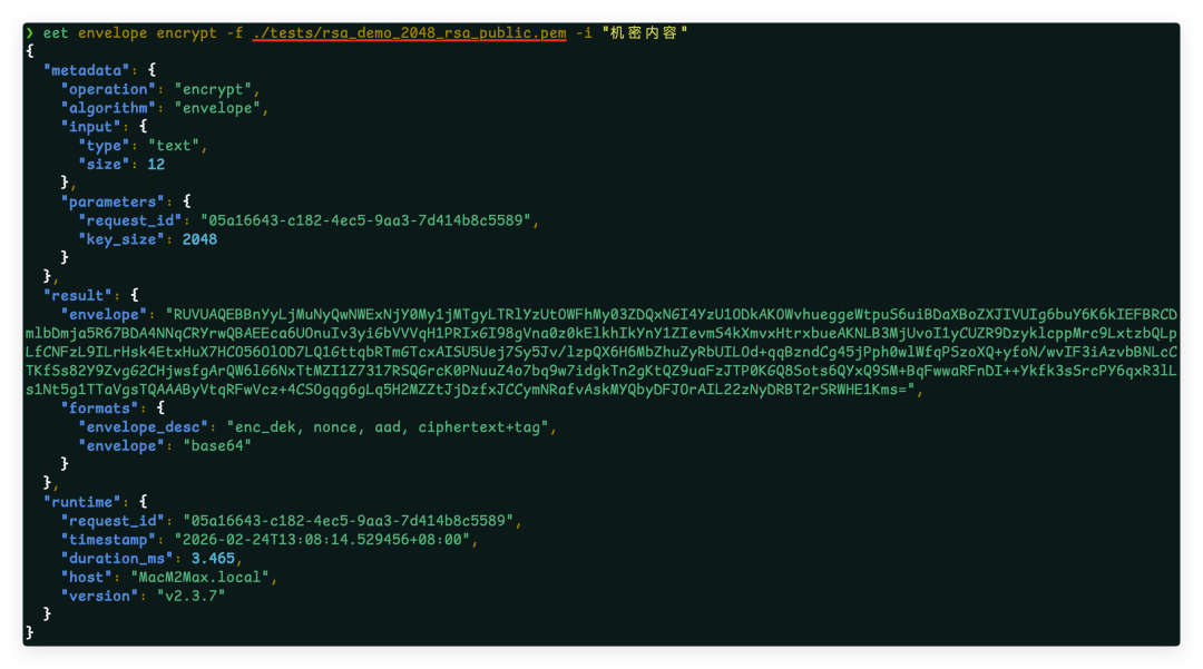 eet envelope encrypt -f envelope_key_public.pem -i "机密内容"