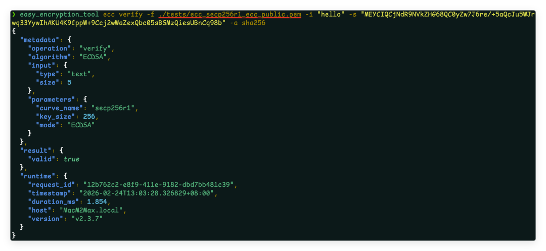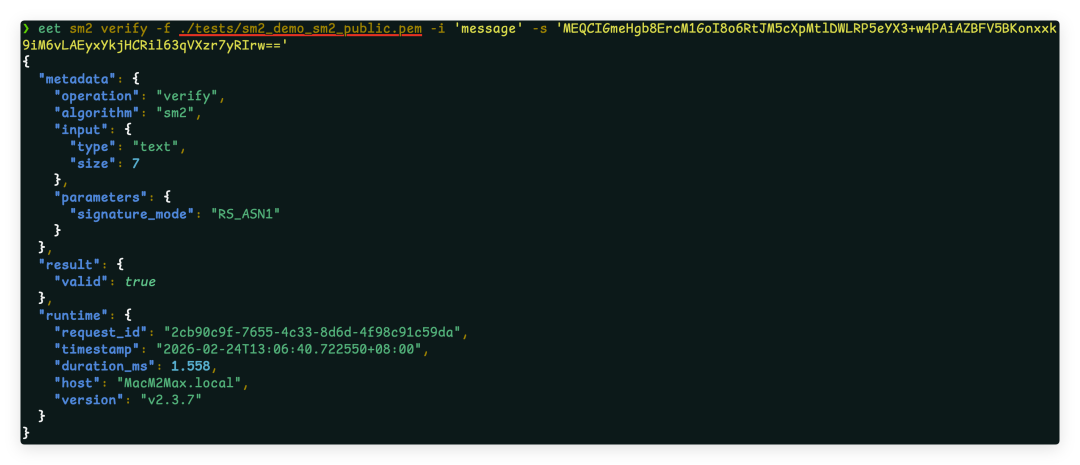 eet sm2 verify -f my_sm2_public.pem -i "message" -s "<signature>"