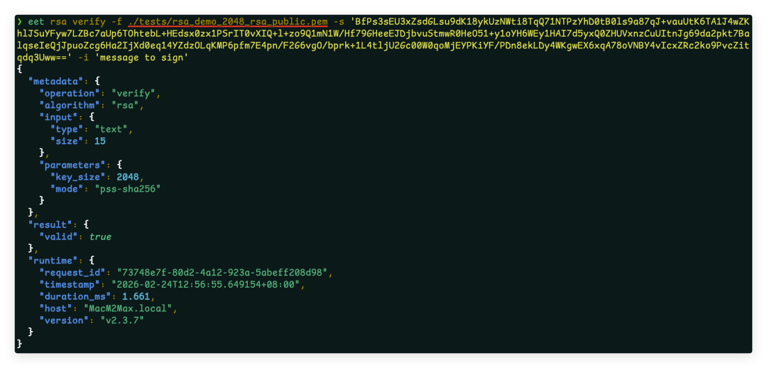 eet rsa verify -e pem -f my_rsa_public.pem -i "message to sign" -s "<signature>"