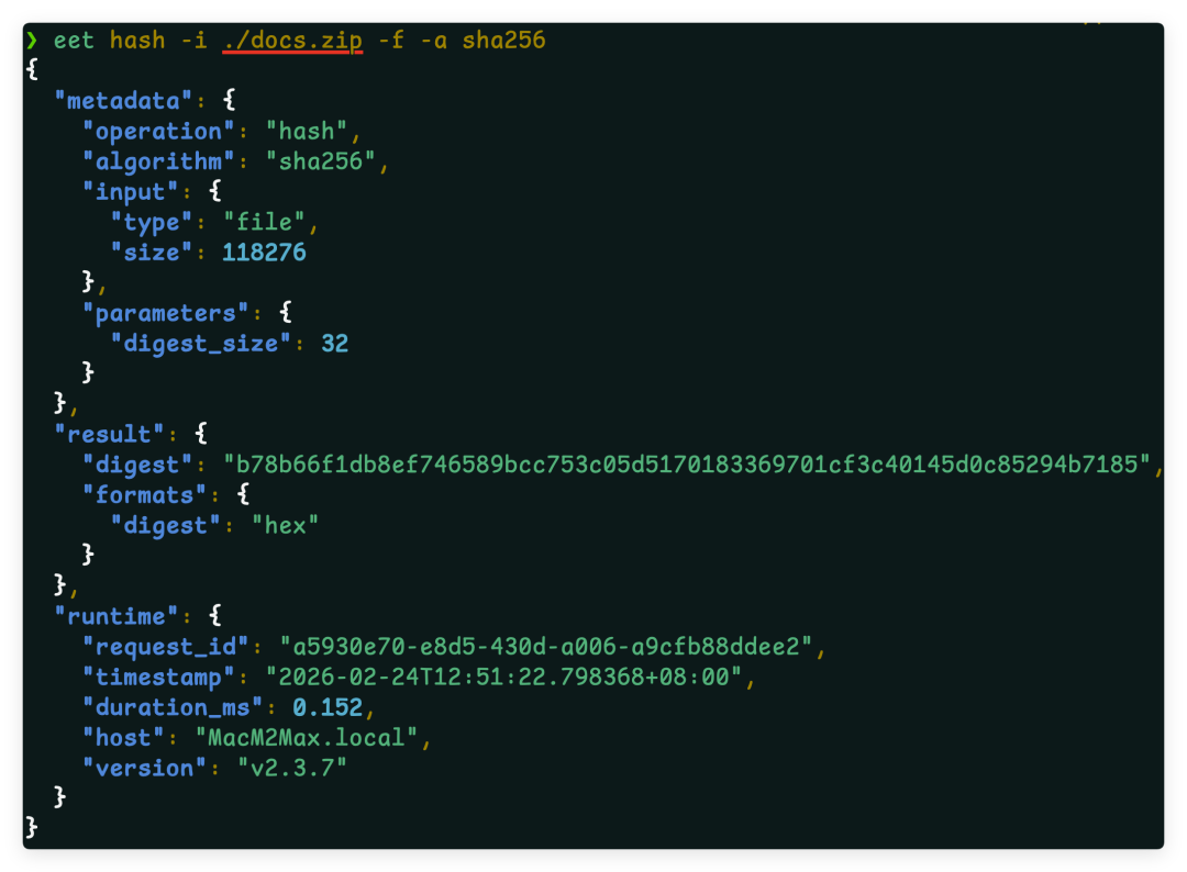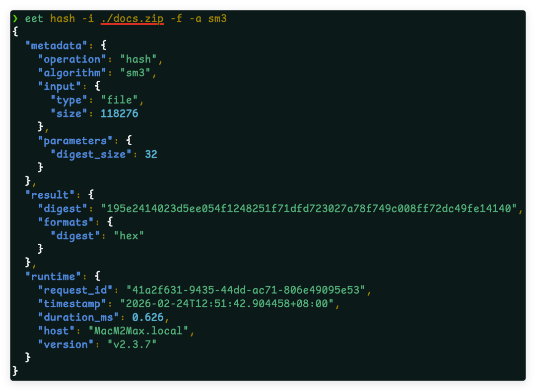 eet hash -i ./file.bin -f -a sha256支持 SHA224/256/384/512、SHA3-224/256/384/512、SM3。
