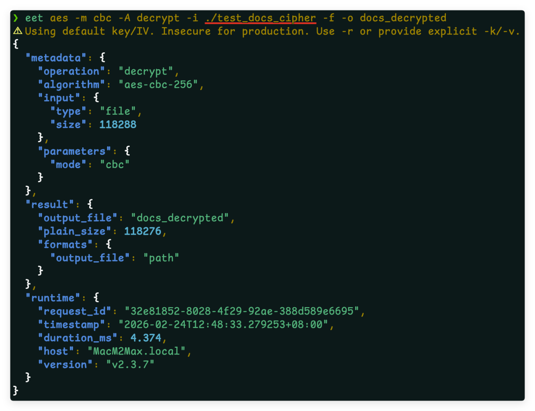 eet sm4 -m cbc -A decrypt -i ./config.json.enc -f -o ./config_restored.json