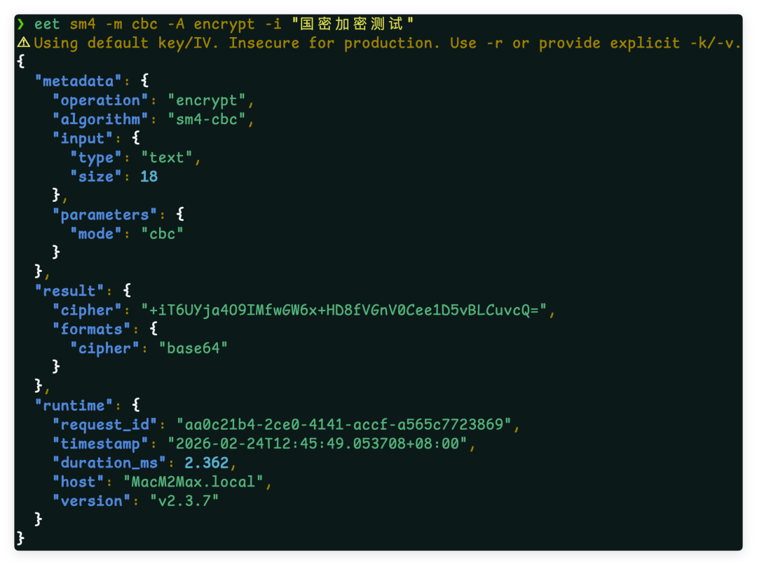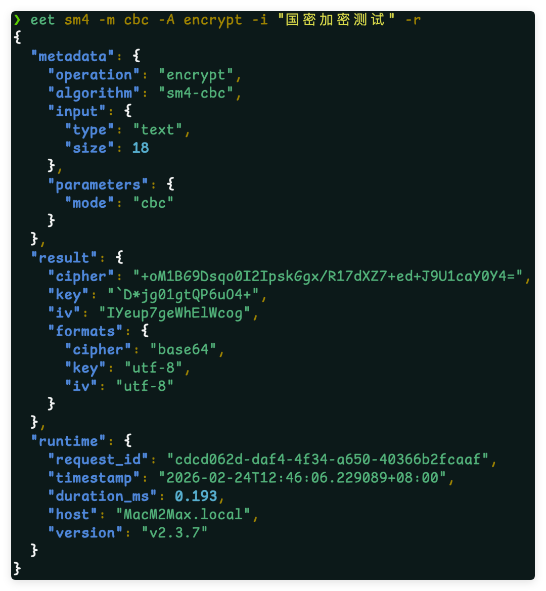 eet sm4 -m cbc -A encrypt -i "国密加密测试"