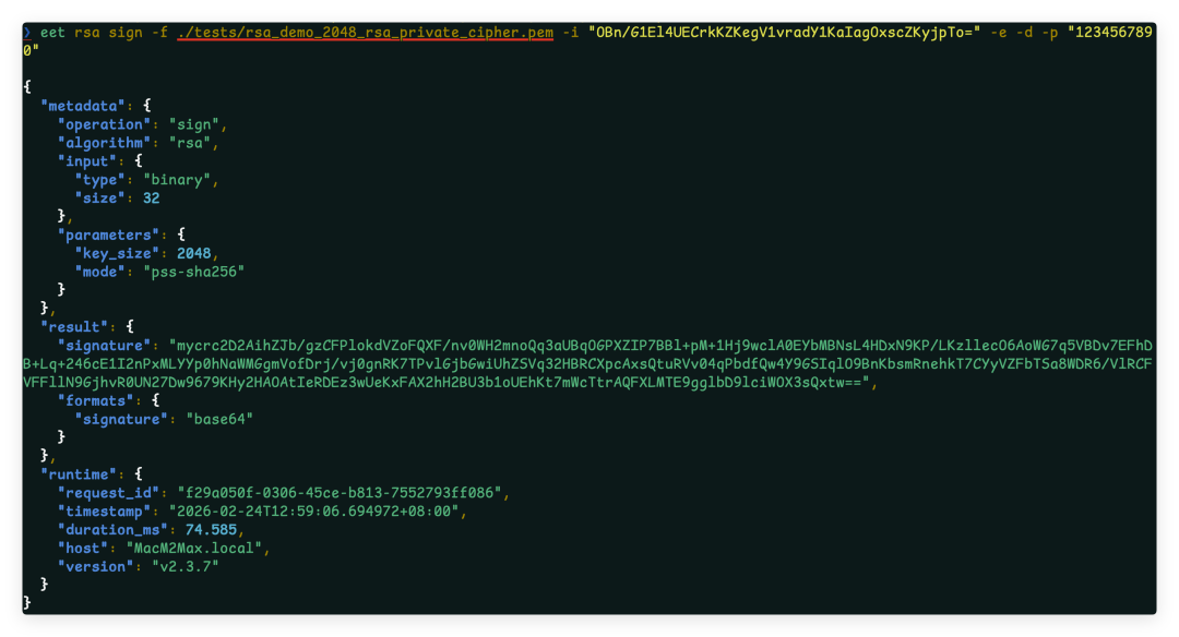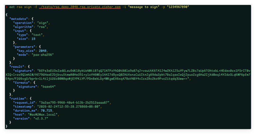 eet rsa sign -e pem -f my_rsa_private.pem -i "message to sign" -p "strong_password"