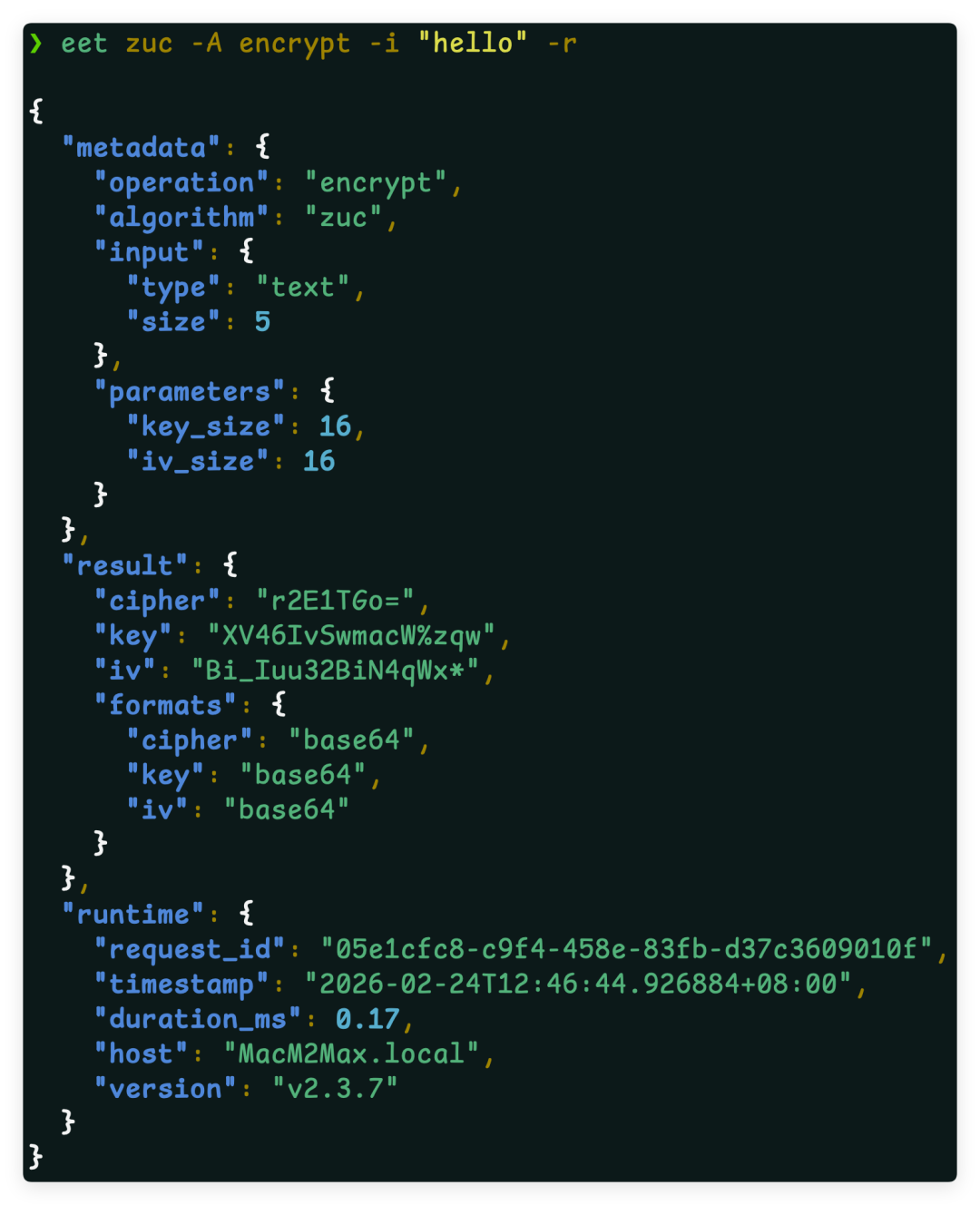 eet zuc -A encrypt -i "hello" -r