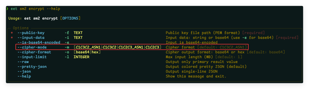 eet sm2 encrypt -f pub.pem -i "data" -m C1C2C3