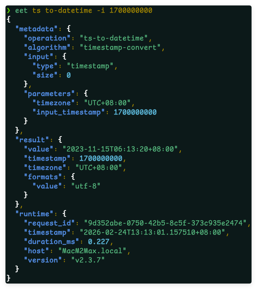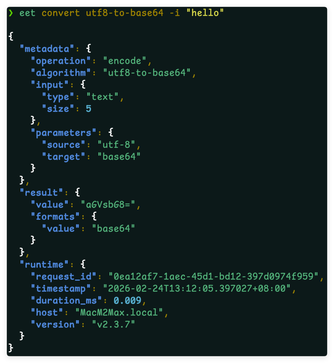 eet install-completion --shell zsh -p ~/.zshrc.d/eet-completion.zshEET 支持多种输出格式,便于脚本或管道使用: