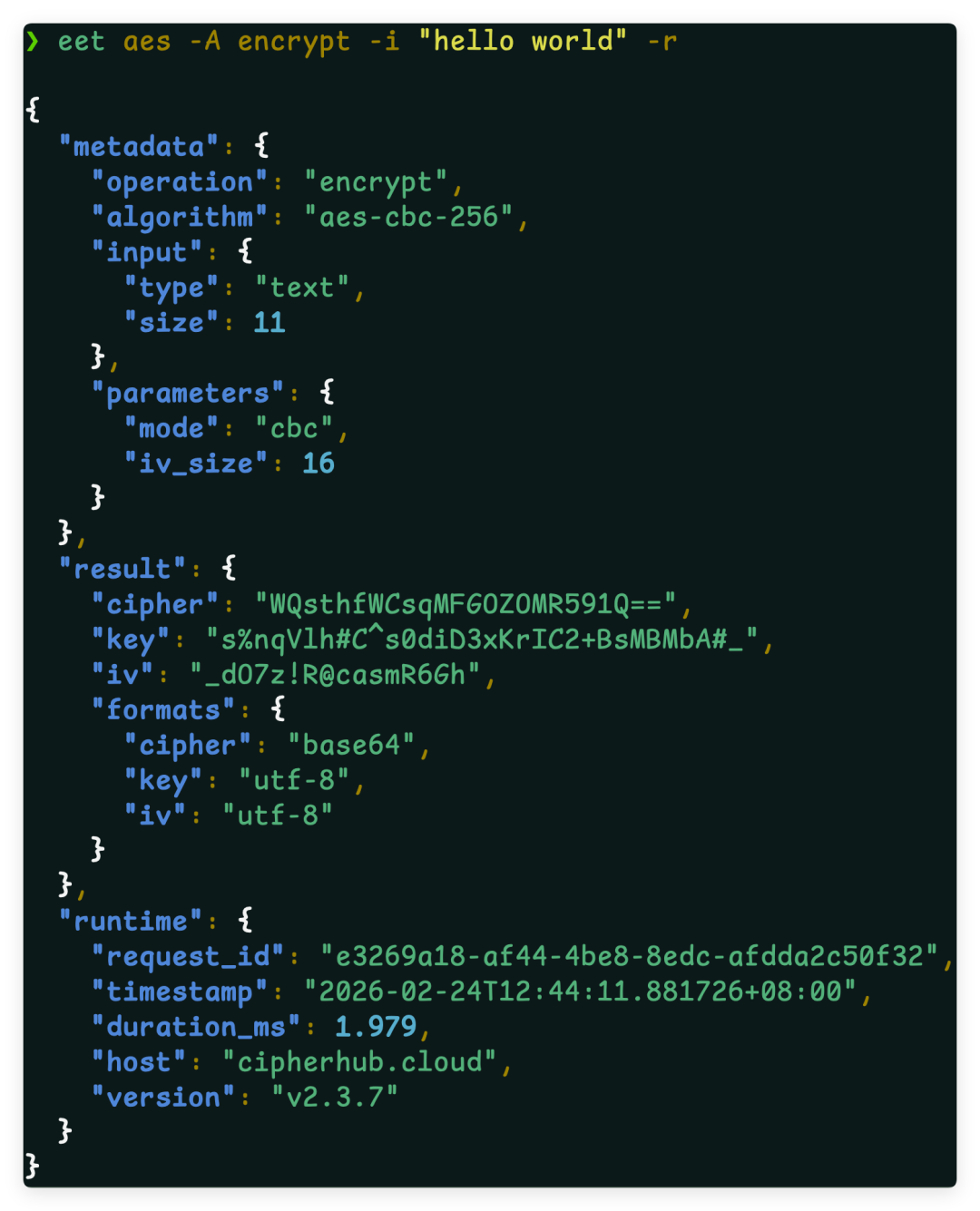 eet aes -m gcm -A encrypt -i "hello world"