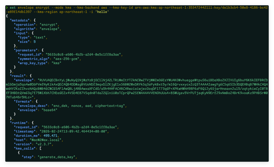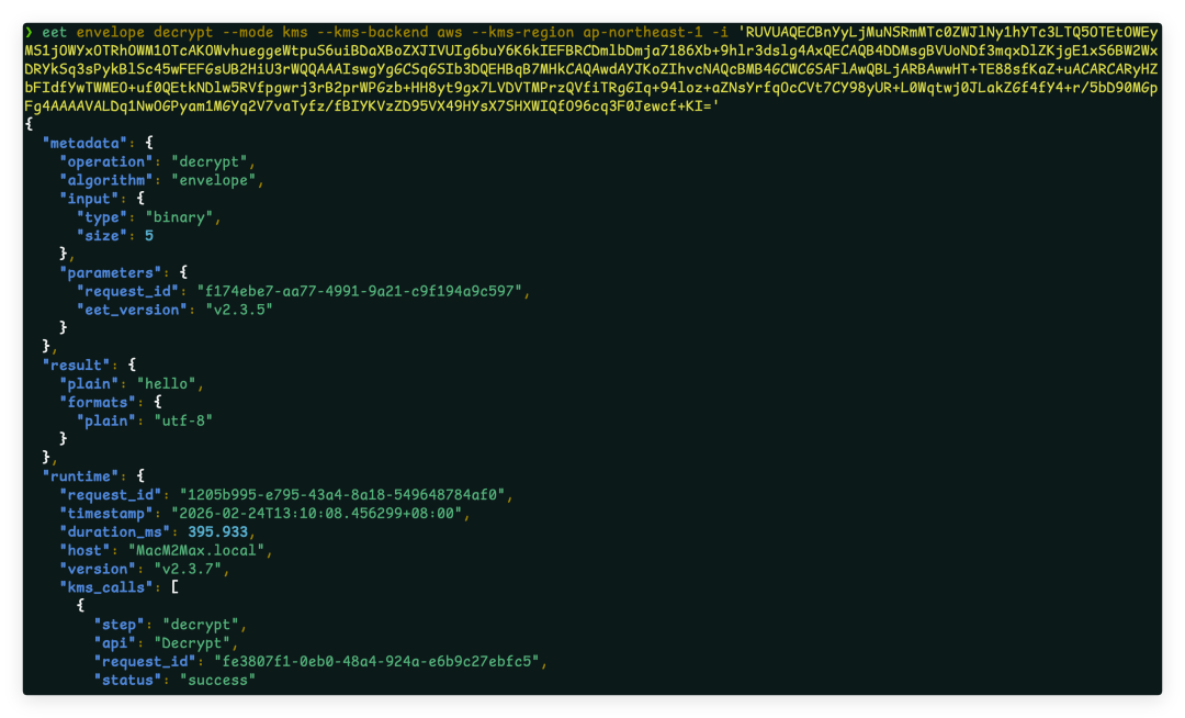 eet envelope decrypt -f envelope_key_private.pem -i data.env --from-file -o plain.txt需安装 easy_encryption_tool[kms],并配置 AWS 凭据(环境变量或 ~/.aws/credentials)。
