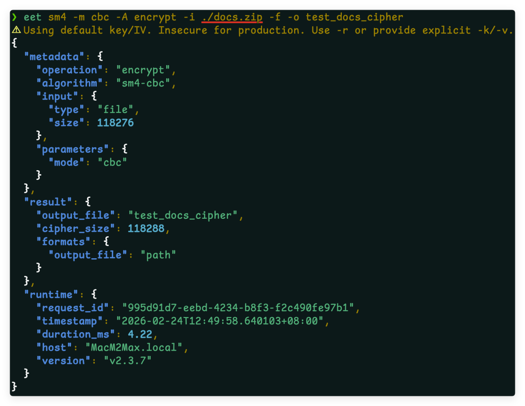 eet sm4 -m cbc -A encrypt -i ./config.json -f -o ./config.json.enc