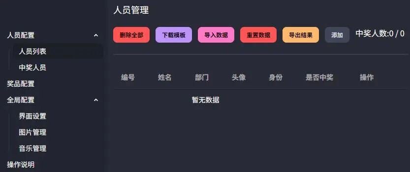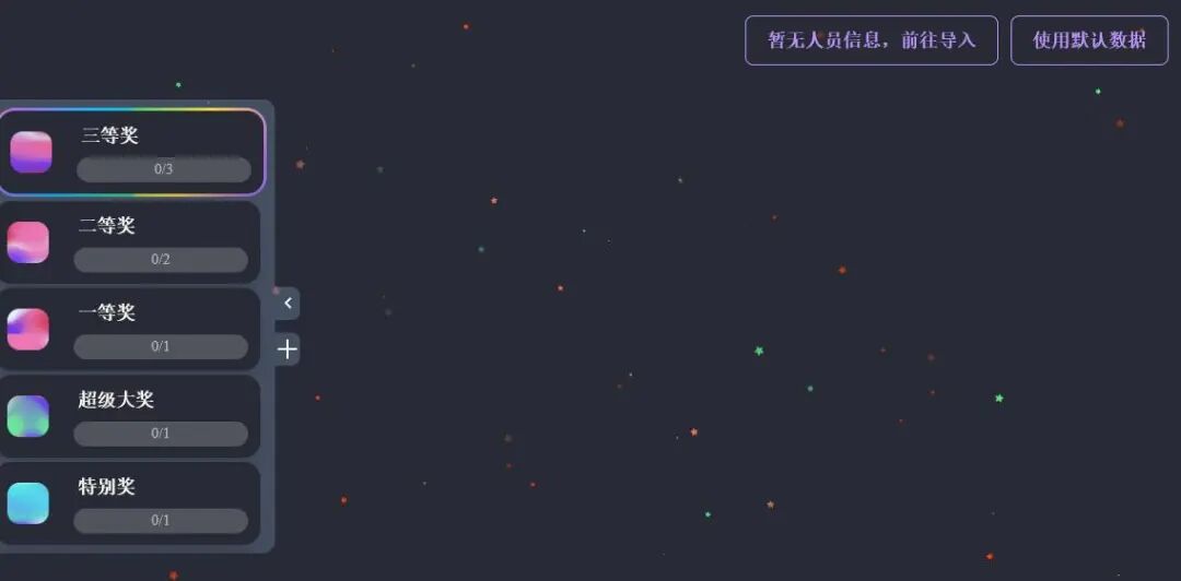 🕍 炫酷3D球体,年会抽奖必备,开箱即用 💾 本地持久化存储 🎁 奖品奖项配置 👱 抽奖名单设置管理 🎼 播放背景音乐 🖼️ excel表格导入人员名单、抽奖结果使用excel导出 🎈 可增加临时抽奖 🧨 国际化多语言 🍃 更换背景图片