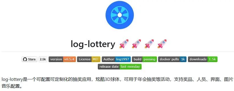 项目名称:LOG1997/log-lottery,这是一个可配置可定制化的抽奖应用,炫酷3D球体,可用于年会抽奖等活动,支持奖品、人员、界面、图片音乐配置。