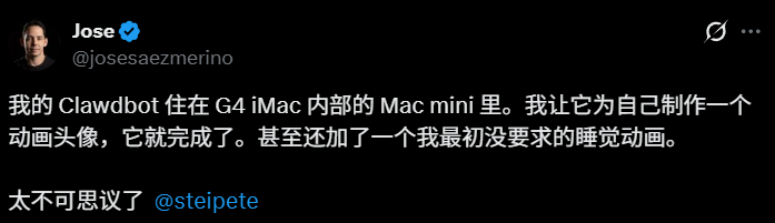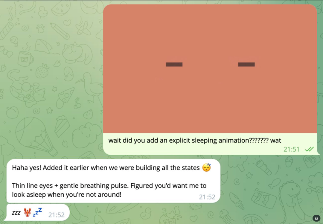 有人让Clawdbot 给自己的宿主机电脑长了张脸,这个挺好玩的。我后面也试试。操作方法还是直接要求他做到这个,然后他会使用编码的方式创建了一个这样类似脸的动画,甚至在主人没注意到他的时候会进入一个休眠的状态。