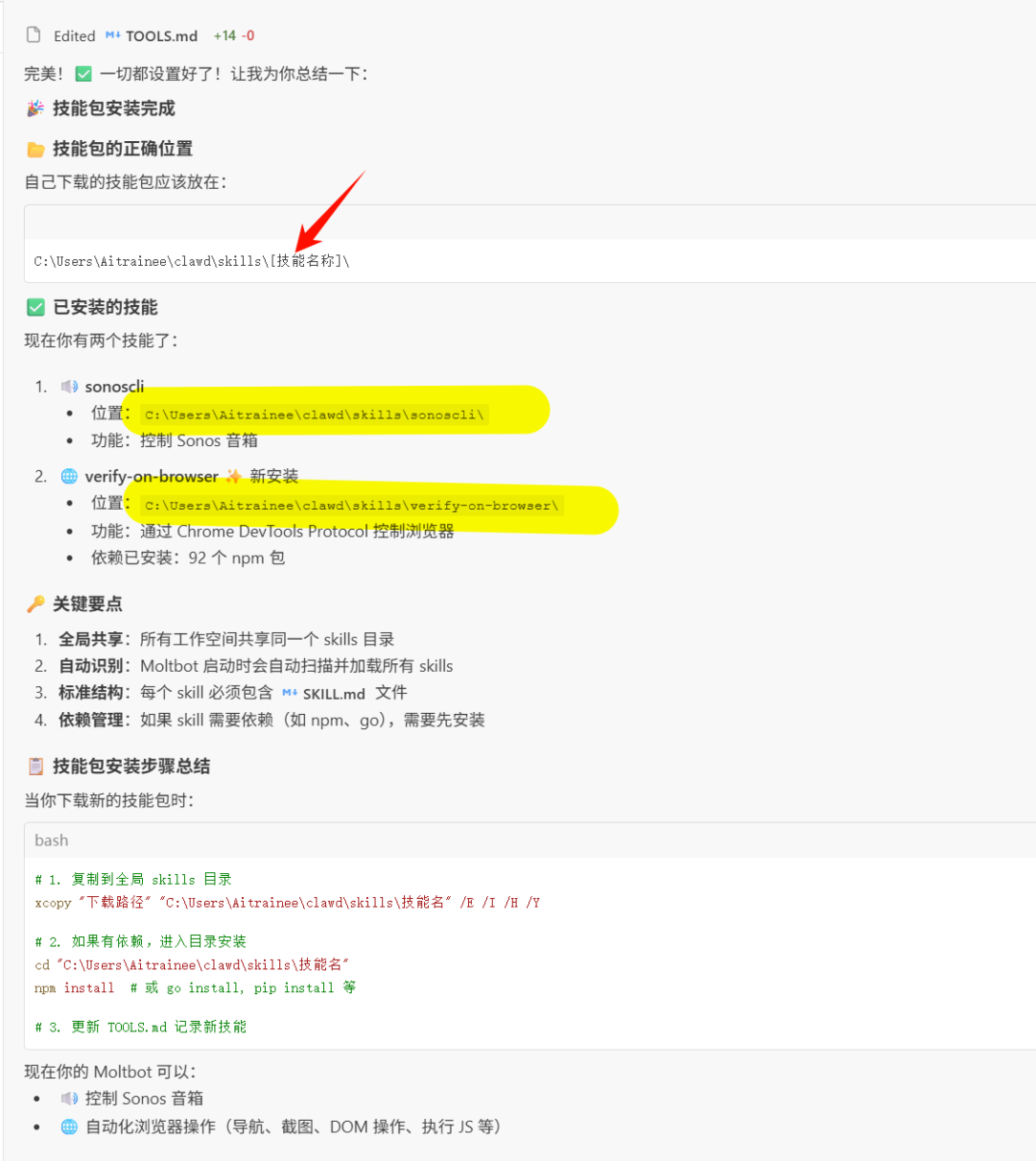 你有什么第三方的 skills 技能包的时候,可以先问问 AI,让它告诉你把那个解压后的压缩包放在哪里。windows 在这:C: \Users\用户名 xx\clawd\skills\