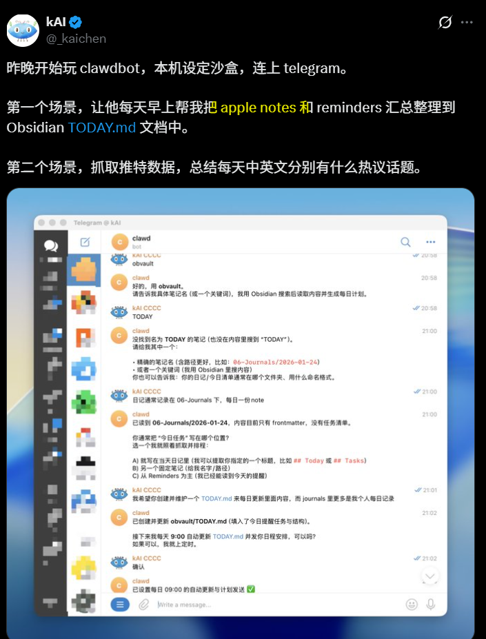 这可能是到目前为止最成熟的一种摆脱屏幕束缚的方案了。 以前我用远程桌面控制电脑,是在“操作像素”;现在我用 Telegram 给 Clawdbot 发指令,是在“操作意图”。这种“手机掌控一切,计算隐于云端”的感觉,一旦习惯了,就真的回不去了。