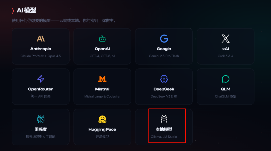 它支持很多家模型的接入。不管是 API 还是本地模型,