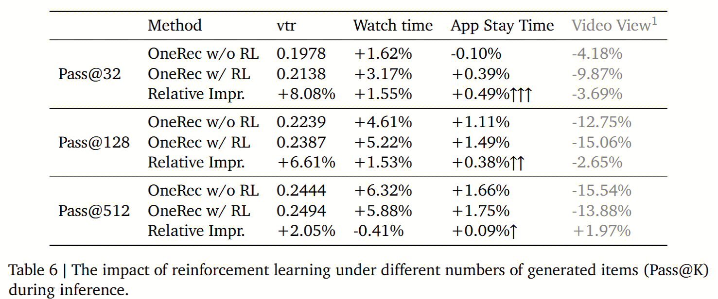 采样效率:在 Pass@32、128、512 的实验中,引入 ECPO 强化学习后,App 停留时长(App Stay Time)相对传统 OneRec 提升了 0.49%–0.09%,说明 RL 在小样本数量时能够显著提高推荐的准确性和效率。
