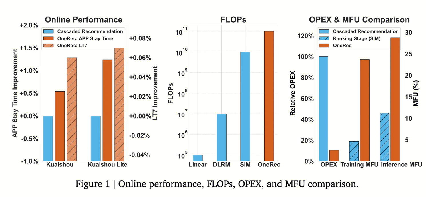 在覆盖 5% 流量的实验组中,仅用 OneRec 生成结果就接近传统多级系统表现;进一步加上奖励模型筛选后,主站停留时长分别提升了 +0.54%(快手)和 +1.24%(快手 Lite),7 天留存(LT7)也各自上涨 +0.05% 和 +0.08%。在本地生活服务场景,OneRec 更带来 21.01% 的 GMV 增长与 18% 以上的用户与订单提升。