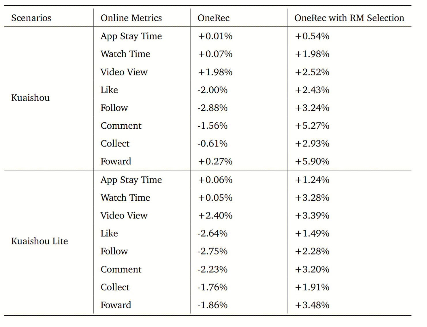 目前已在Kuaishou/Kuaishou Lite APP上线25%流量,同时线上收益明显,快手App主端停留时长+0.5%,快手极速版App停留时长+1.24%,其他核心指标如互动率,冷启动、内容分布均衡上都有一定收益。