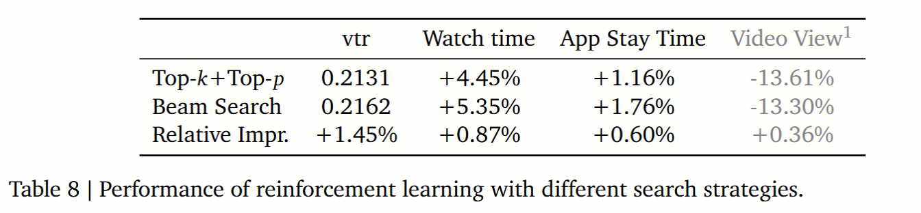对于RSFT,我们根据播放时长过滤掉曝光会话中的底部50%。由于beam search计算开销较大,对于RL,我们从RSFT数据中随机选择1%的用户生成RL样本。