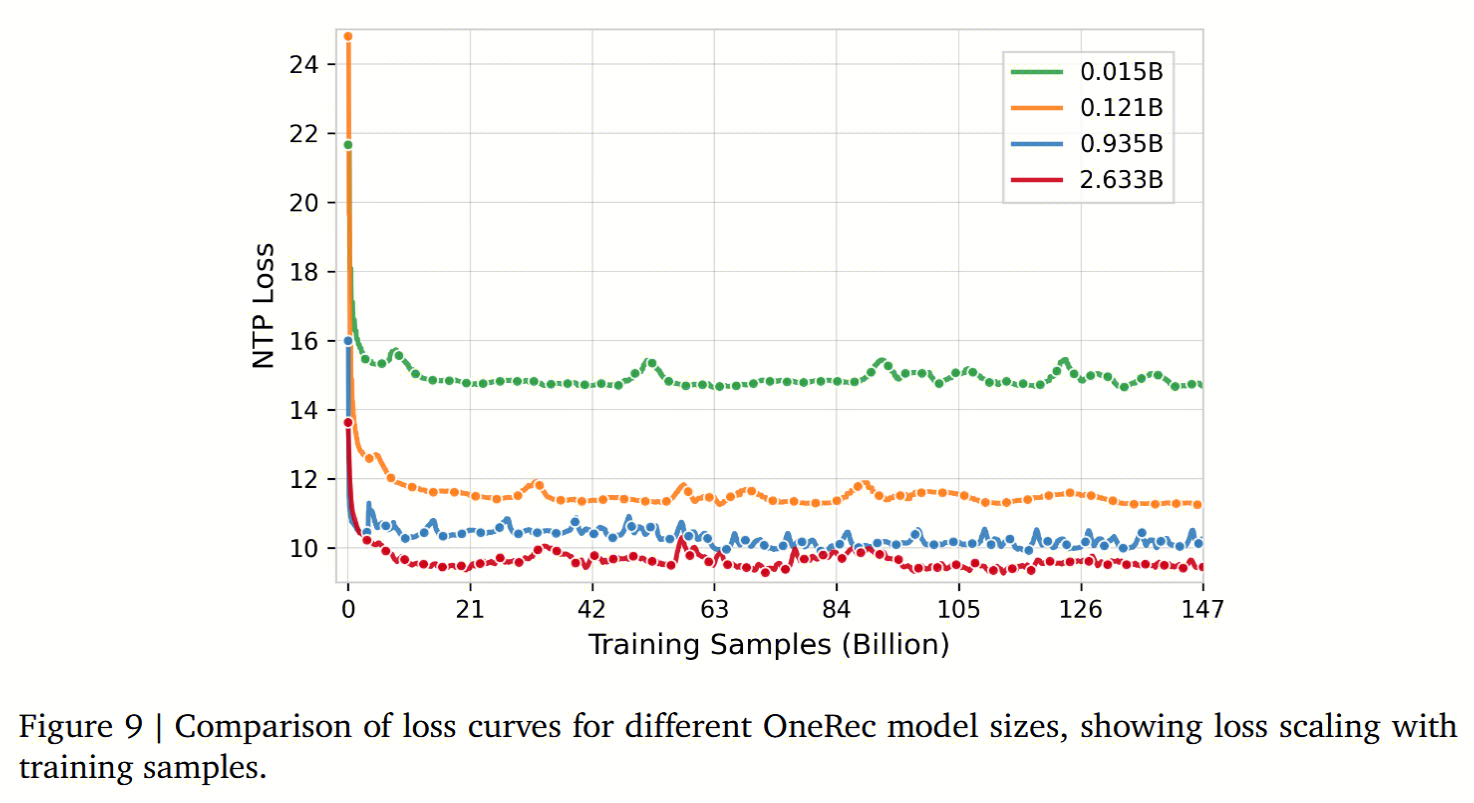 在预训练阶段,平台每天处理大约180亿条训练样本,产生540亿个语义ID。OneRec-0.935B一般跑到 1,000 亿样本左右就能收敛,大约训3000亿token。