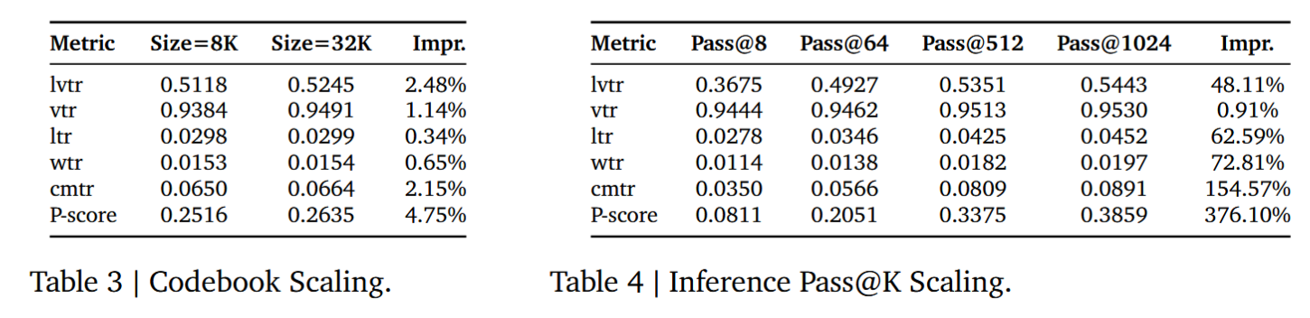 3.Codebook Scaling 增大码本大小后播放时长(playtime)指标有显著提升,交互(interaction)指标也有轻微提升。