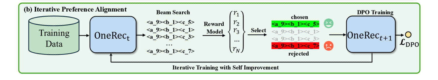 使用 ECPO(Early Clipped GRPO)进行优化。简洁地来说,在推理中通过beamsearch的方式,为一个用户生成多个item,并使用奖励模型进行打分,从中选出打分最高的和打分最低的作为pair对,并使用DPO进行偏好对齐。