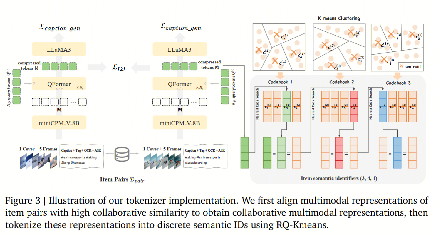 分词器将item的多模态表征通过量化的方式离散化成token序列。相较于之前只关注视频文字或图片的做法,onerec引入了更多模态的信息,且融入了用户行为信息。具体的离散化方式使用了快手之前的论文QARM: Quantitative Alignment Multi-Modal Recommendation at Kuaishou(https://arxiv.org/pdf/2411.11739)中的思路。