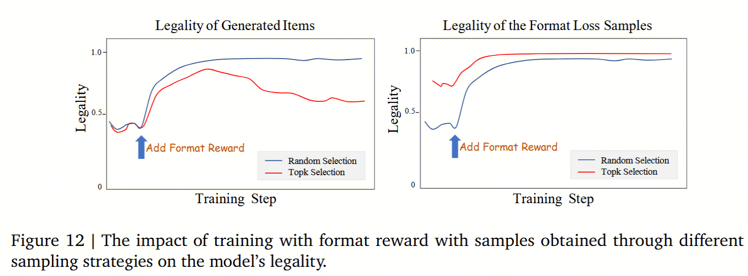 合法性:为了保证模型生成的语义id都是可用的,OneRec 在强化学习里还加了格式奖励鼓励模型的合法生成。具体做法是:从一批生成结果中随机选择K个样本进行合法性强化学习,把能对应到实际视频的标记当作奖励,非法或找不到视频的直接丢掉。