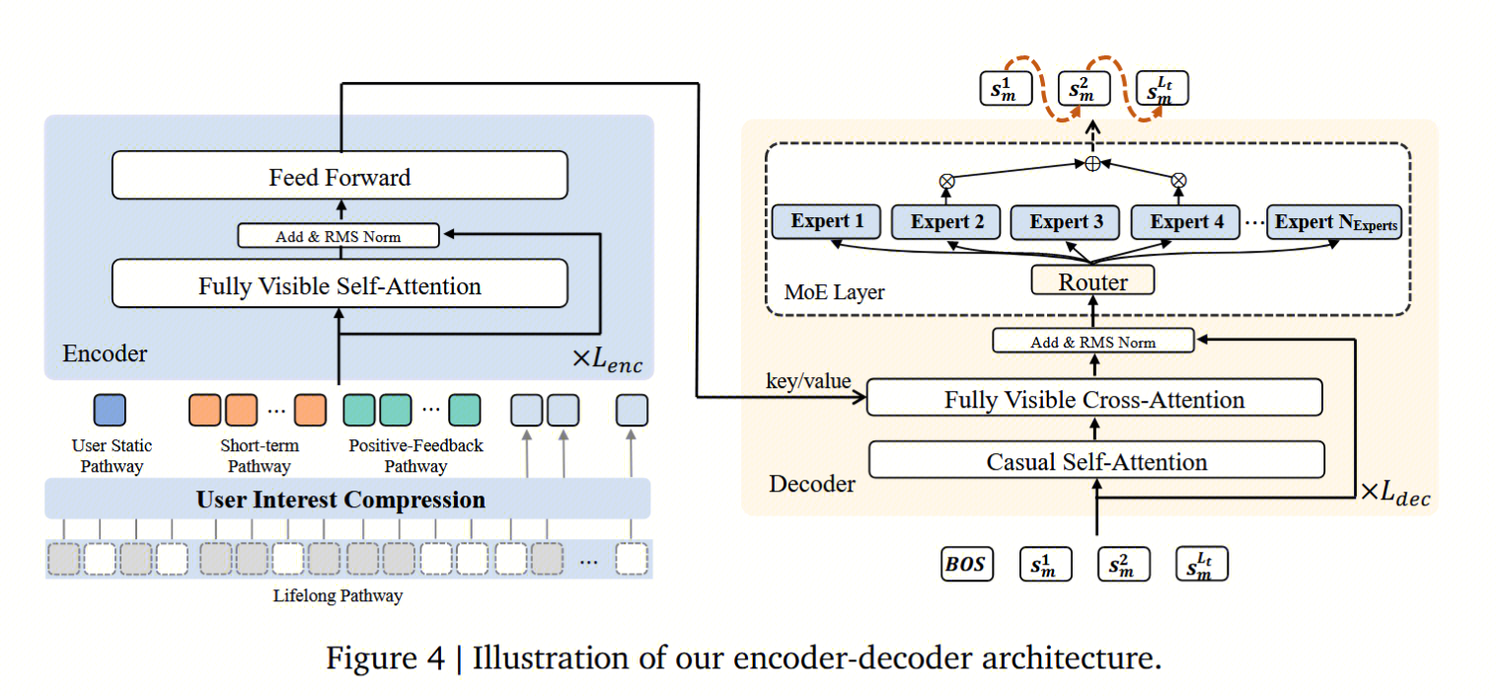 OneRec 采用 Encoder-Decoder 架构,将推荐问题转化为序列生成任务,由四个核心部分组成:分词器、编码器和解码器,外加一个在后续训练中用来微调的奖励系统。