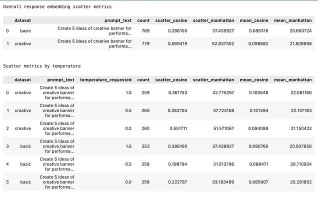 目标不是找到完美的度量方式,而是回答两个问题:提示词变更能不能转化为一致的数值差异?单次任务上的创造力/确定性到底取决于提示词还是仅取决于温度?