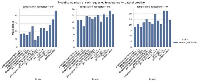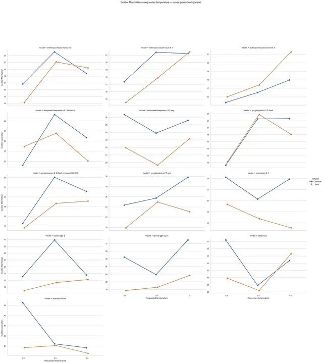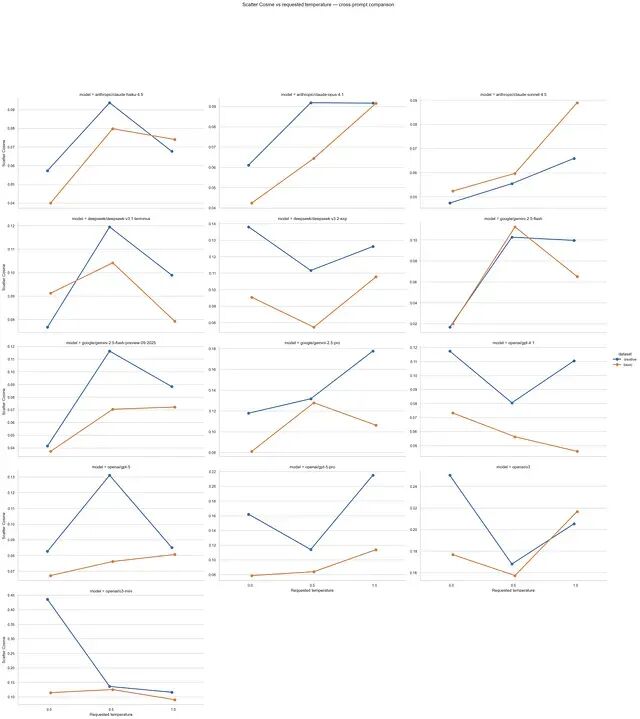 跨模型来看有三个明显趋势:在提示词中加入明确的创造力指令,曲线一致上移;提高温度在一定程度上增大了响应多样性,但受限于小样本,这个结论还需谨慎看待;各模型对温度变化的响应方式差异很大没有统一规律。