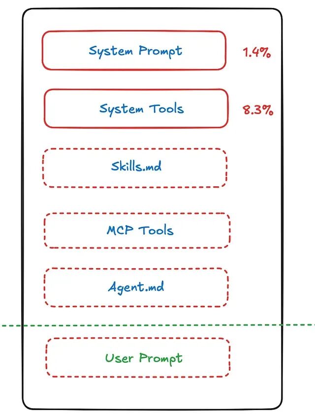 拿 Claude 举例,它的上下文窗口大致是这么分配的:系统提示词占 1.4%系统工具(包括 MCP 工具)占 8.3%,Agent 上下文(技能、工具描述、对话历史)吃掉约 70%,用户实际能用的提示词空间反而很小。