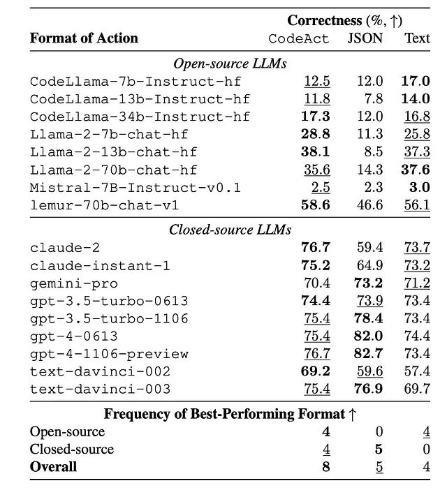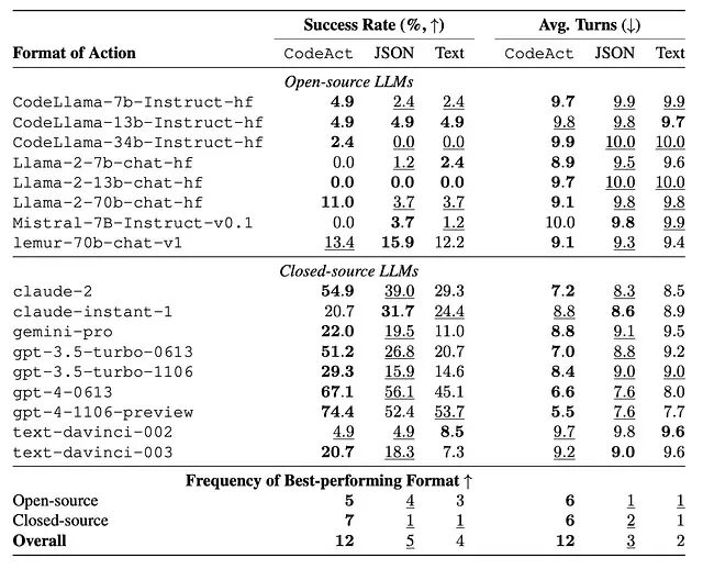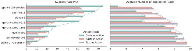 即便在这种完全用不上控制流优势的简单场景下,CodeAct 在多数模型上的正确率都持平甚至更高。GPT-4、Claude 这些闭源模型在三种格式上都表现稳定,但开源模型从 CodeAct 中获益明显更大。合理的解释是:预训练阶段见过大量代码的模型,用代码表达动作比用 JSON 更自然、更顺手。