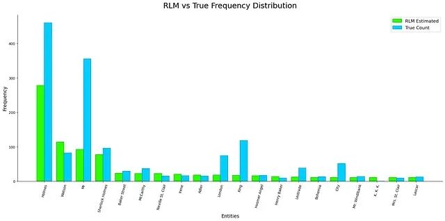 跟确定性正则匹配的计数比,RLM 的输出有轻微偏差。这可以理解因为RLM 做的是跨 chunk 的递归语义实体提取,不是严格的词法计数。聚合过程中会引入累计漂移,高频实体和变体形式尤其容易受影响。但关键是模型准确识别了语料库的主要叙事主题。RLM 追求的是结构化的语义理解而非 Token 粒度的精确计数。