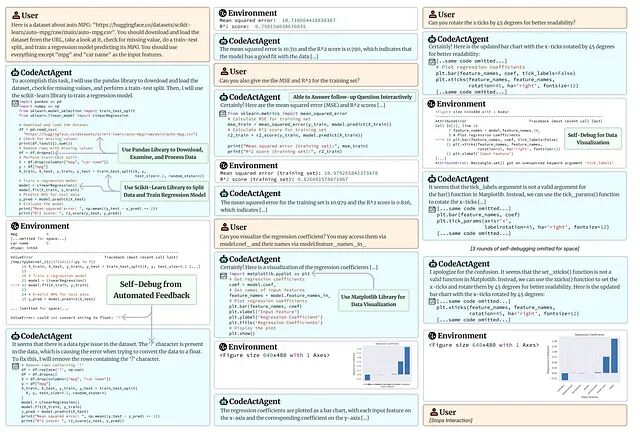 论文里展示了一个典型案例:CodeActAgent 先用 Pandas 下载数据,然后训练回归模型、可视化系数,中间碰到 matplotlib 报错就自己修,发现缺失值就自己处理。整个过程不是简单的工具调用,而是基于执行反馈的迭代推理。